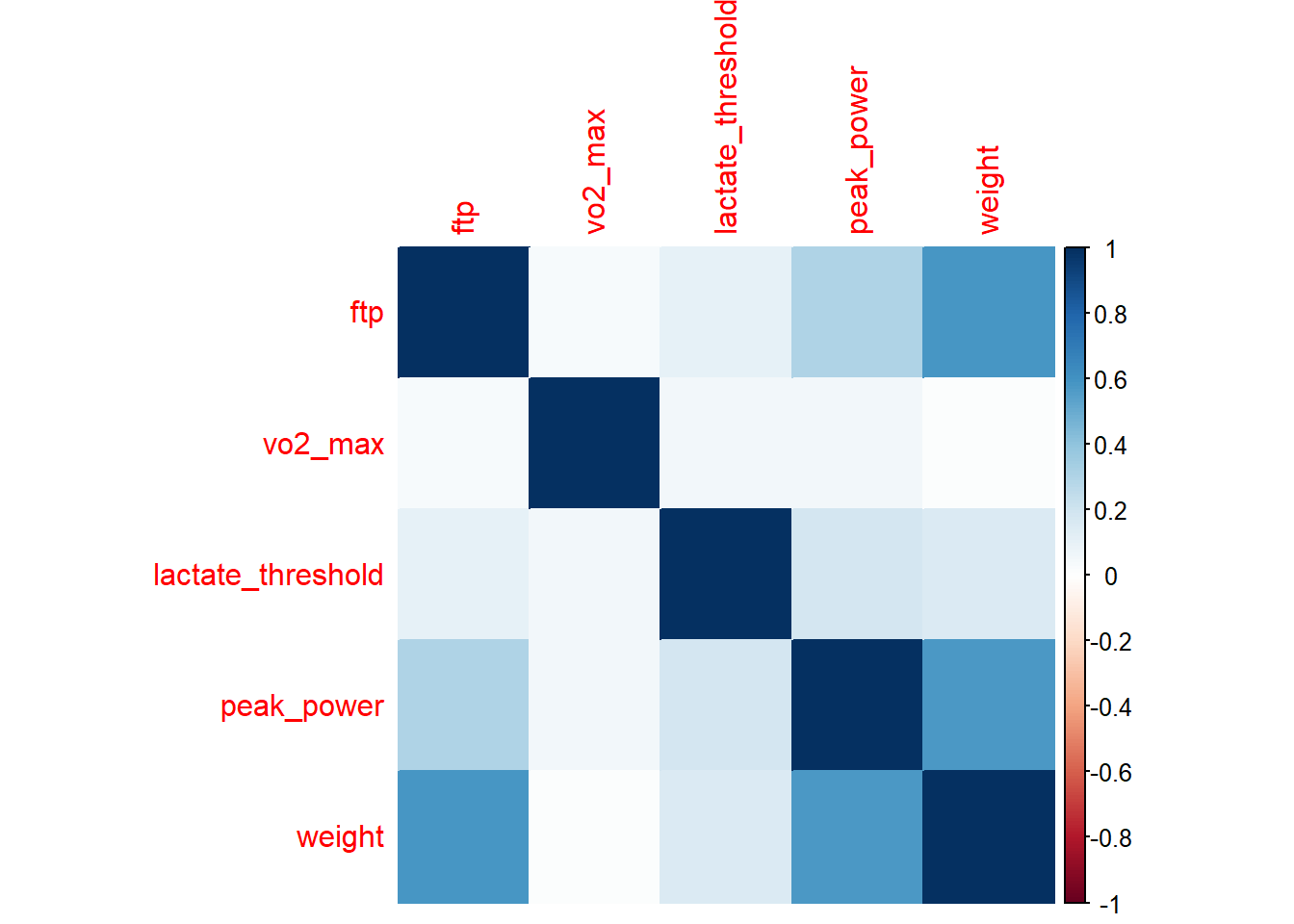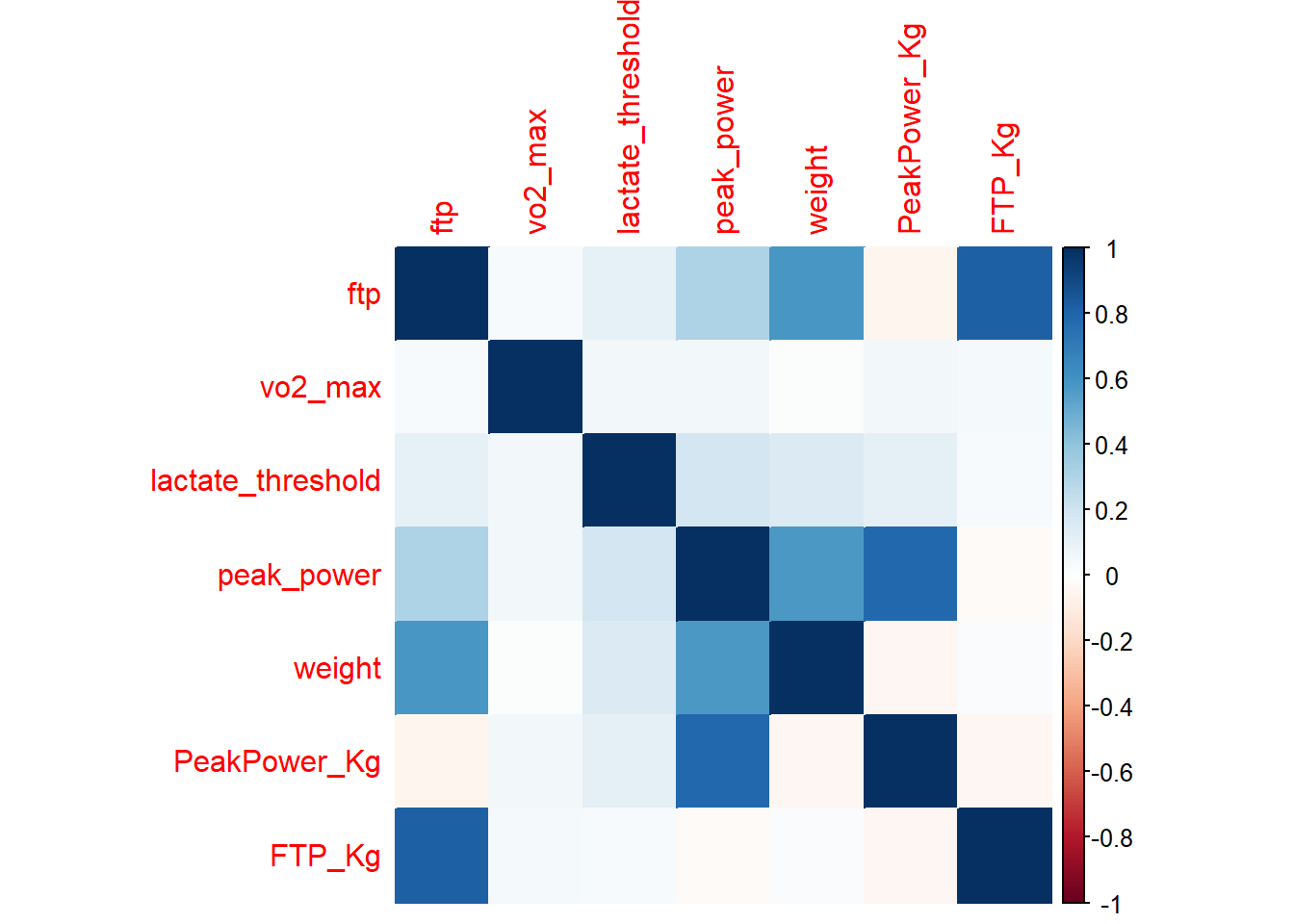 corrplot(CorrelationMatrix, method= "color")# High correlation between ftp and weight (also between lactate threshold and peak_power but we will ignore this for now)