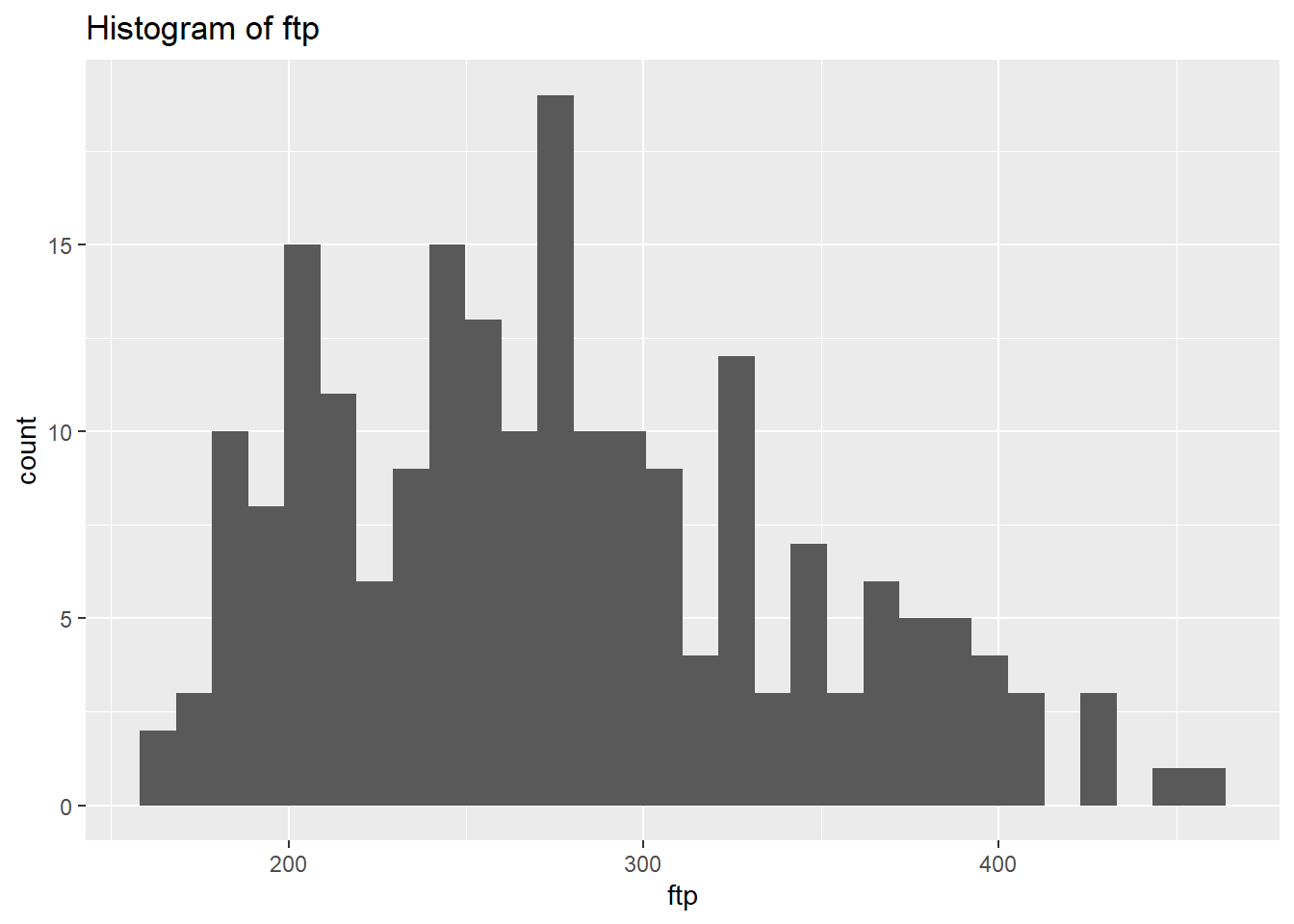CyclingDataFilteredDF$vo2_max<-ifelse(CyclingDataFilteredDF$vo2_max<40,NA,CyclingDataFilteredDF$vo2_max)Exercise 3: Next up let’s focus on the variables we plan to use: ftp, VO2max, lactate threshold, peak power and weight. Create a new dataframe with just these variables and check their normality and correlation and make the appropriate corrections (focus mainly on ftp).