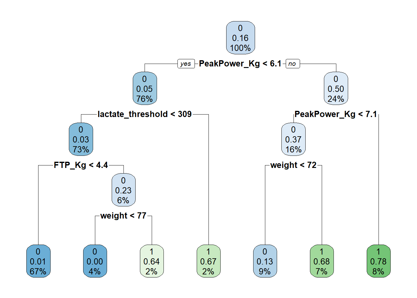 # Left indicates yes, right indicates no.We have now build a decision tree using the KPIs we identified earlier via regression analysis. Peak power comes out as the most important variable which is in line with what we found in our regression analysis. What we see in this tree is at the first node there is 16% predicted chance of becoming a sprinter (this is without taking anything into account). If peak power per KG body weight is greater than 6.1 the predicted likelihood goes up to 50% (24% of our sample is included in this node), if peak power is greater than 7.1 chances go up to 78%. If peak power is less than 7.1 but a riders weight is greater than 72kg, there is a 68% chance of becoming a sprinter, whereas if weight is less than 72kg, the chances of becoming a sprinter go down to 13%. If however the athletes peak power is less than 6.1 but their lactate threshold is greater than 309 their chance of becoming a sprinter is 67%.