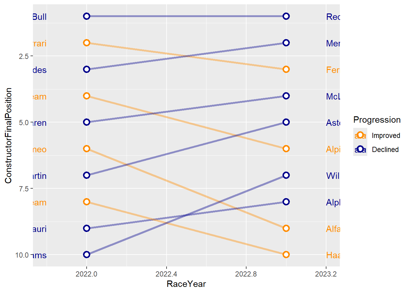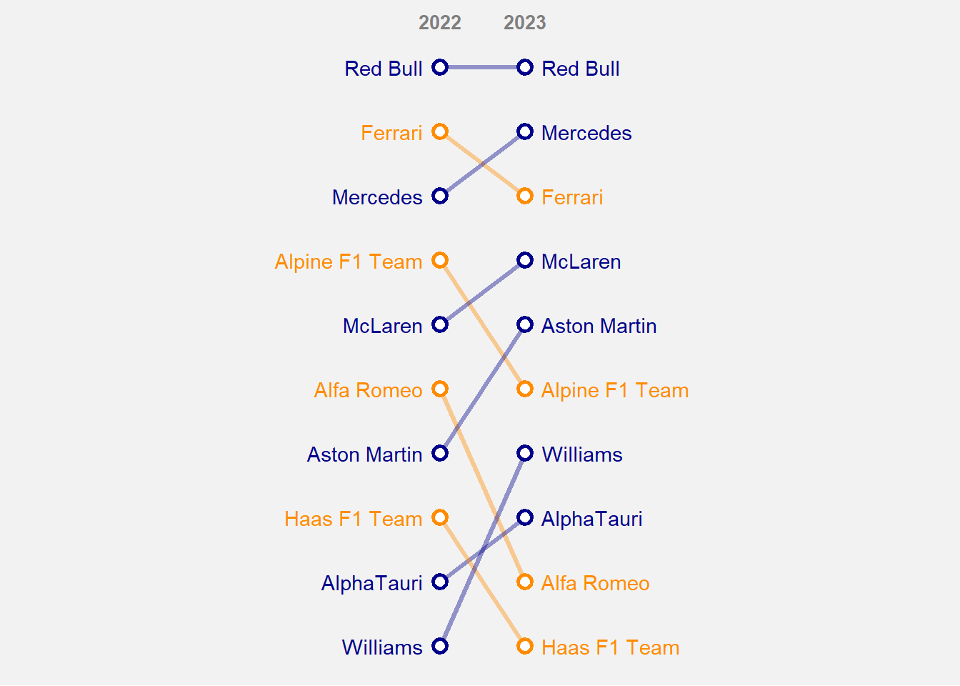 Last we will look at changes from one season to the next. We will create a slope graph showing the constructor competition results from 2022 to 2023. We will also use colour to differentiate between thos who improved and those who did not.