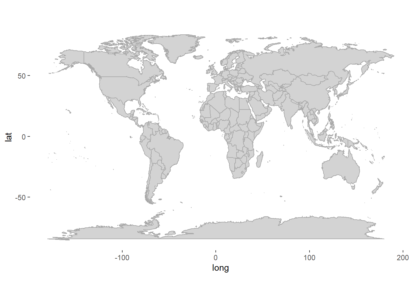 geom_polygon(data = world, aes(x=long, y = lat, group = group),fill = "lightgrey", color = "darkgrey") +
