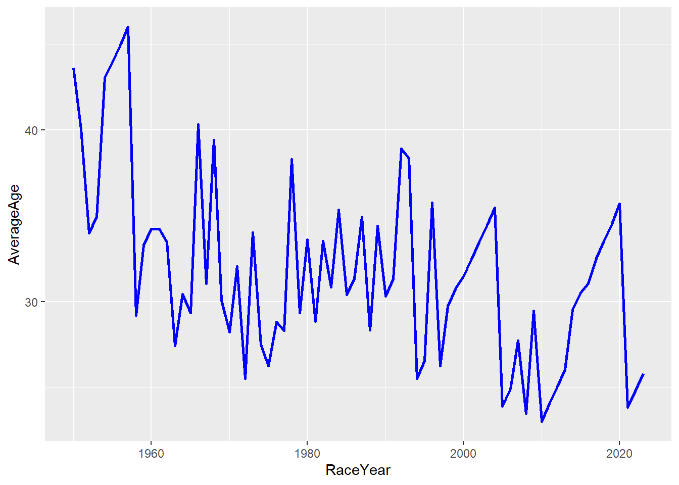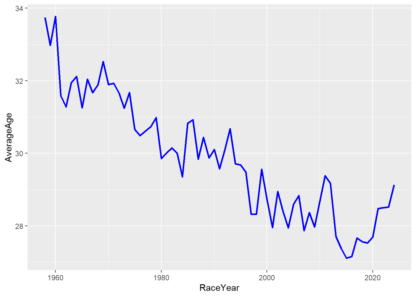 mutate(Age= time_length((date-dob),"years"))Now we have the age of the drivers we can calculate the average age per year for each driver, and use this to create a line graph showcasing the change in F1 drivers from 1958 until 2024.
