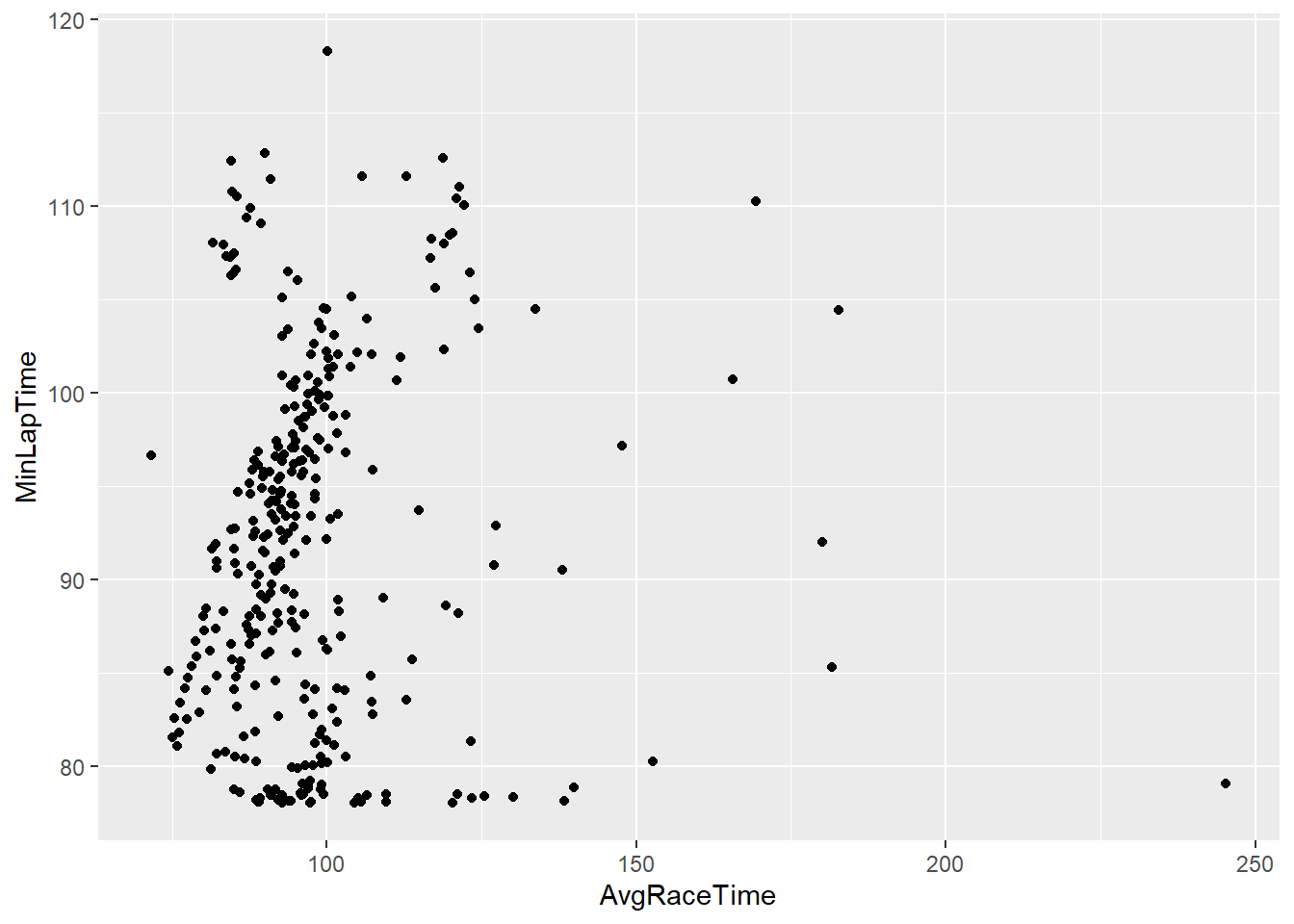ScatterPlot<-ggplot(CorData, aes(AvgRaceTime,MinLapTime)) +