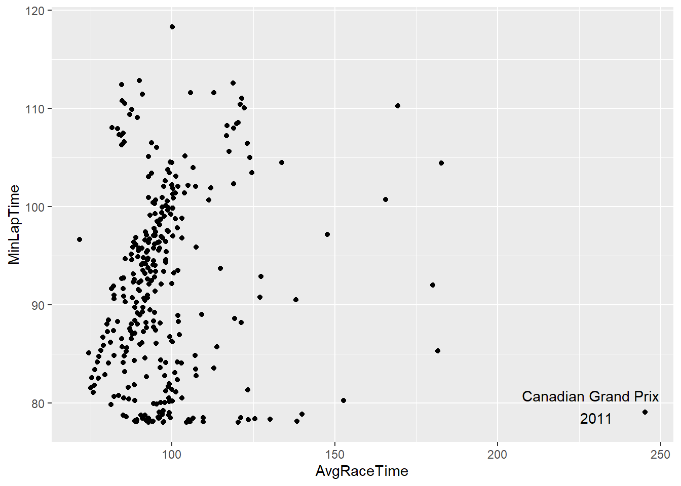 The scatterplot above shows on first view a weak correlation between the average race time and the fastest lap times. Point of interest is the high race time during the 2011 Canadian Grand Prix, worth looking into.
