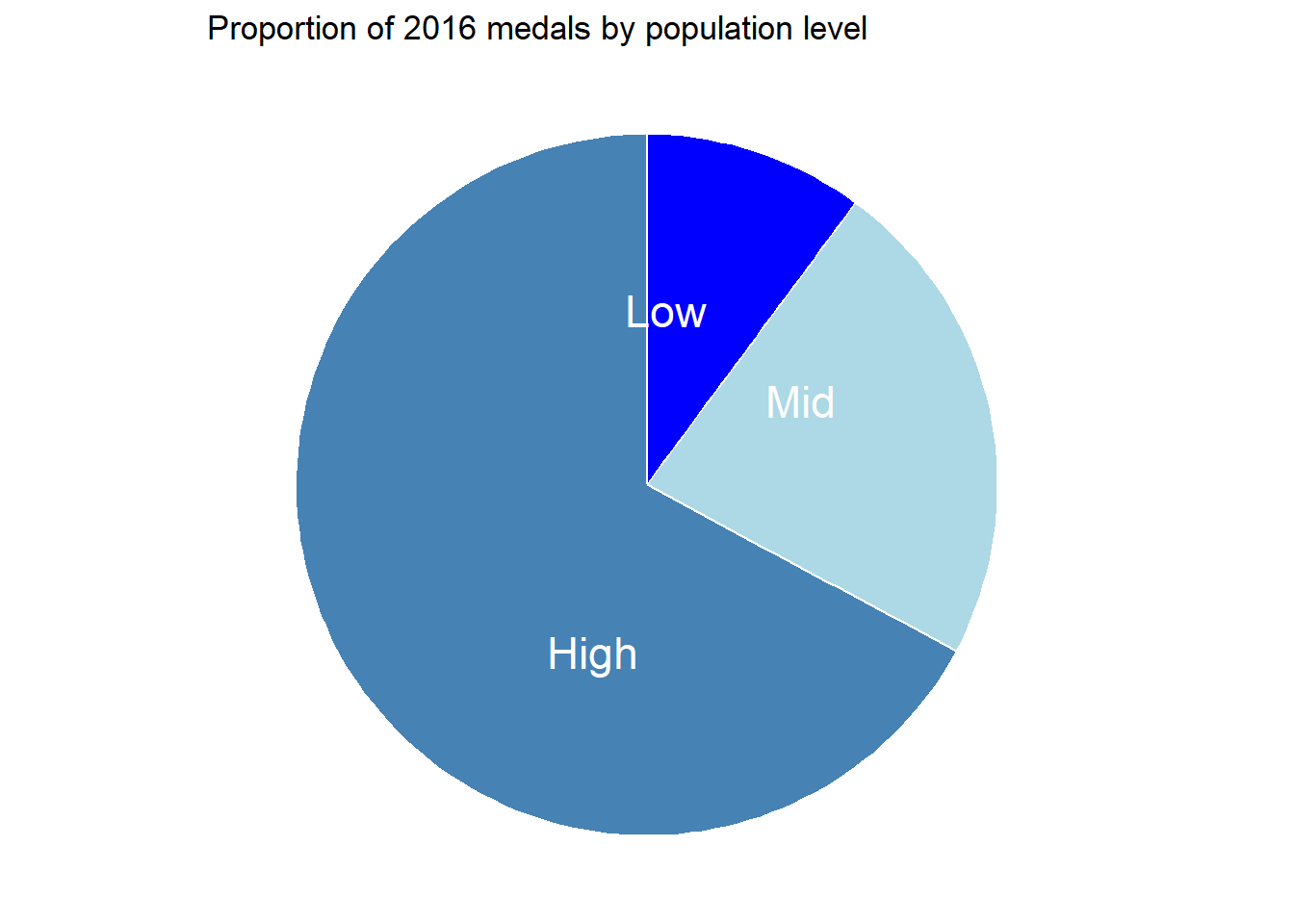 Now imagine we want to examine the percentage of medals won based on population numbers. We decide we will split our sample up into 3 groups, high population, mid population and low population based on 2016 population data.