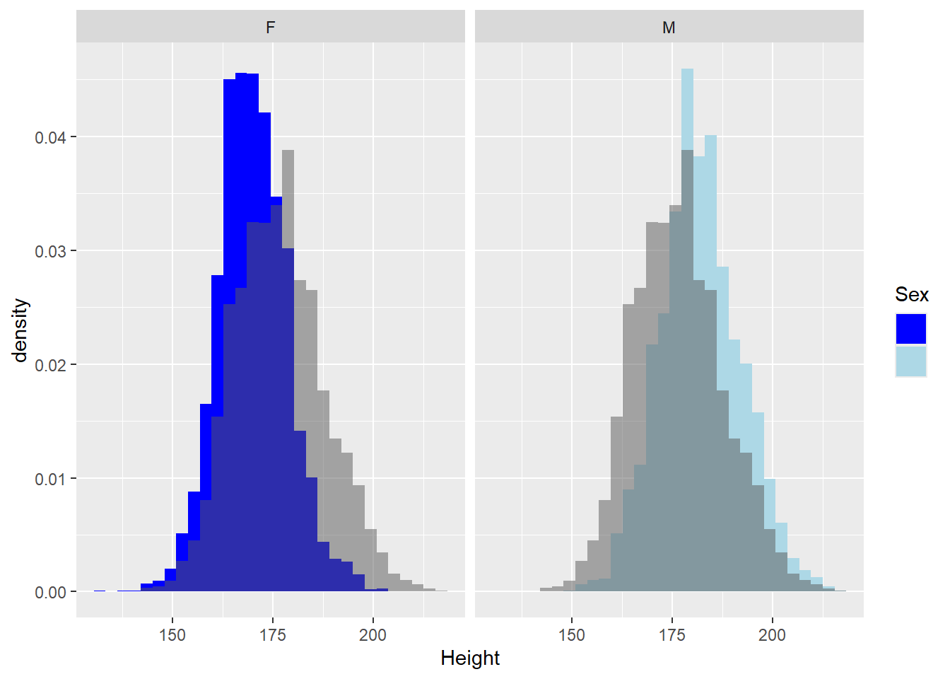 The two graphs above tell us a little bit about the difference between men and women, but it would be even better if we could directly compare the female and male histograms against the total population. To do so we will plot a third histogram but this histogram will be plotted in the already existing facets.