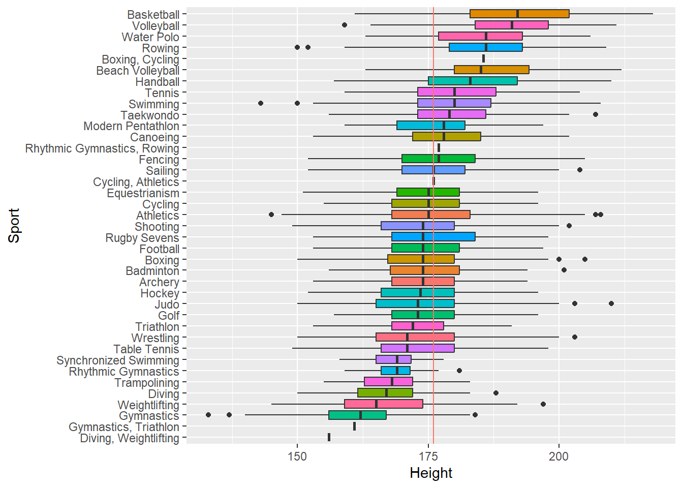 Next up let’s have a look at box-plots. We have seen height differs between Males and Females but I am wondering if we can use height as a selection method for certain sports.