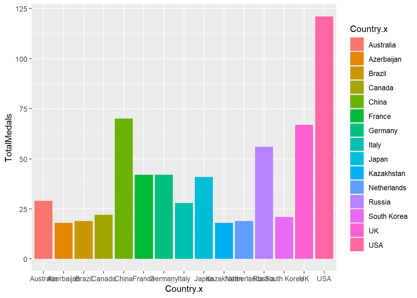 #ggplotly(Barchart, tooltip="Total")In the code above Countries2016DF[1:15,] selects the top 15 rows from the data frame Countries2016DF. aes(x=reorder(Country.x,TotalMedals), y=TotalMedals) specifies the aesthetics of the plot. It uses the reorder() function to order the countries based on the total number of medals (TotalMedals). The x-axis represents the countries, and the y-axis represents the total number of medals.