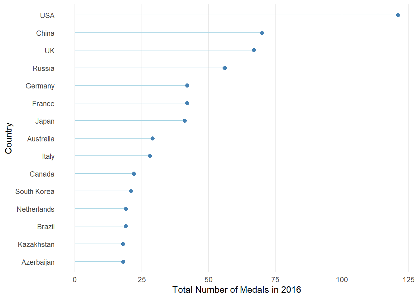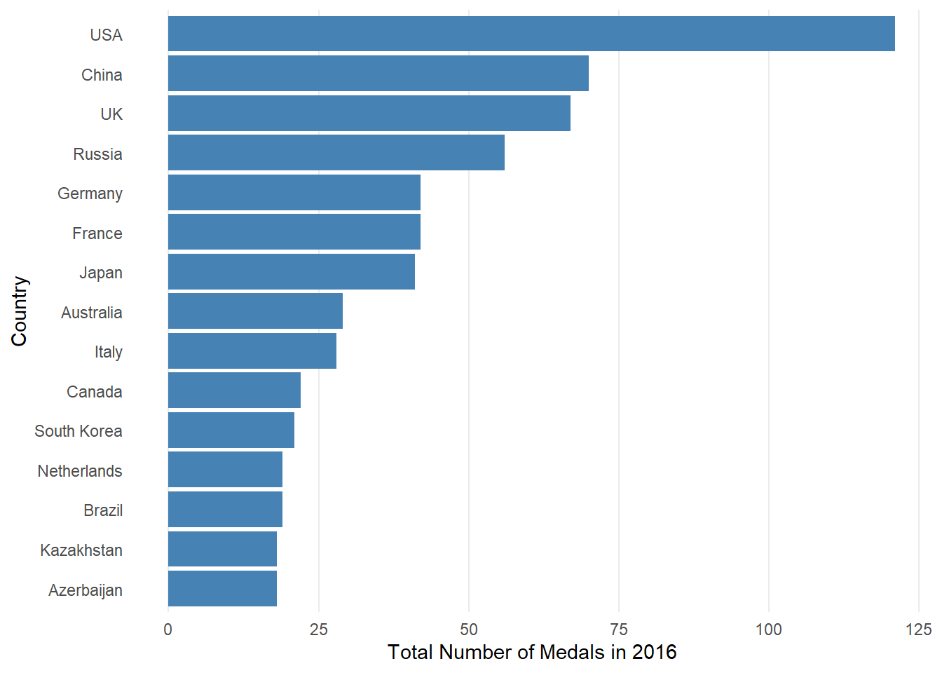 coord_flip is used to flip the coordinates, making it a horizontal bar plot.The labs argument is used to set the axis lables. The x-axis is labaled as “Country” and the y-axis is labeled as “Total Number of Medals in 2016” (remember because we used coord_flip the labels actually appear on the opposite axis). theme() allows us to refine our graph even further. In this case it removes grid lines from the plot. It sets minor vertical grid lines and minor and major horizontal grid lines to be blank.