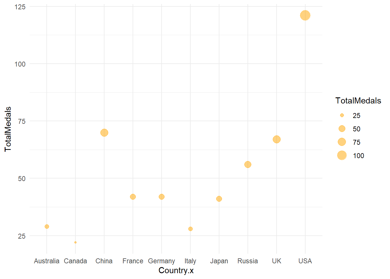 ggplot(aes(x=Country.x,y=TotalMedals, size=TotalMedals)) +