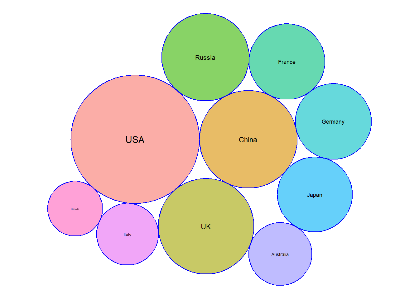 packing <- circleProgressiveLayout(Top10Countries$TotalMedals, sizetype='area')