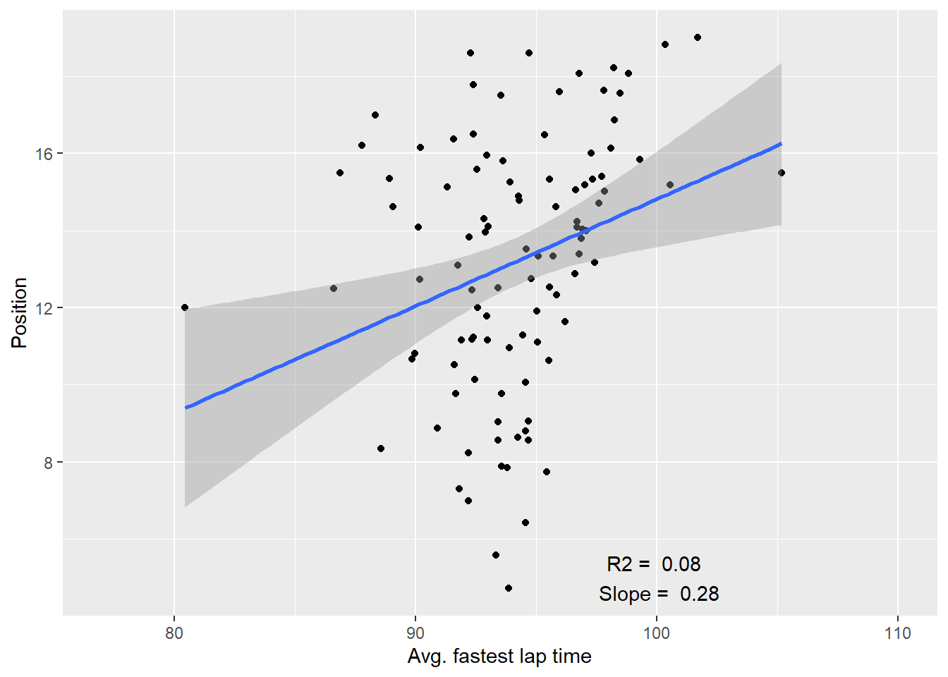 Next up we will look at how we can plot the strength of an association between variables. We will look at the average fastest lap time of drivers and their average finishing position. I.e. does a fastest lap guarantee a good finishing position.