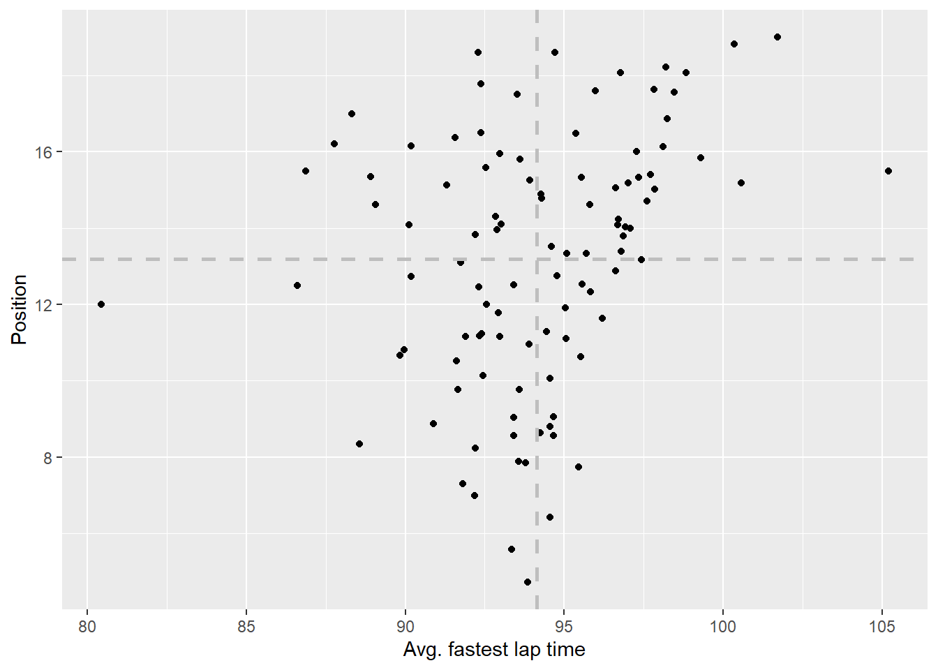 geom_vline(xintercept=mean(DataforCorr$avgFastLapTime, na.rm=TRUE),linetype="dashed",size=1, color="grey")