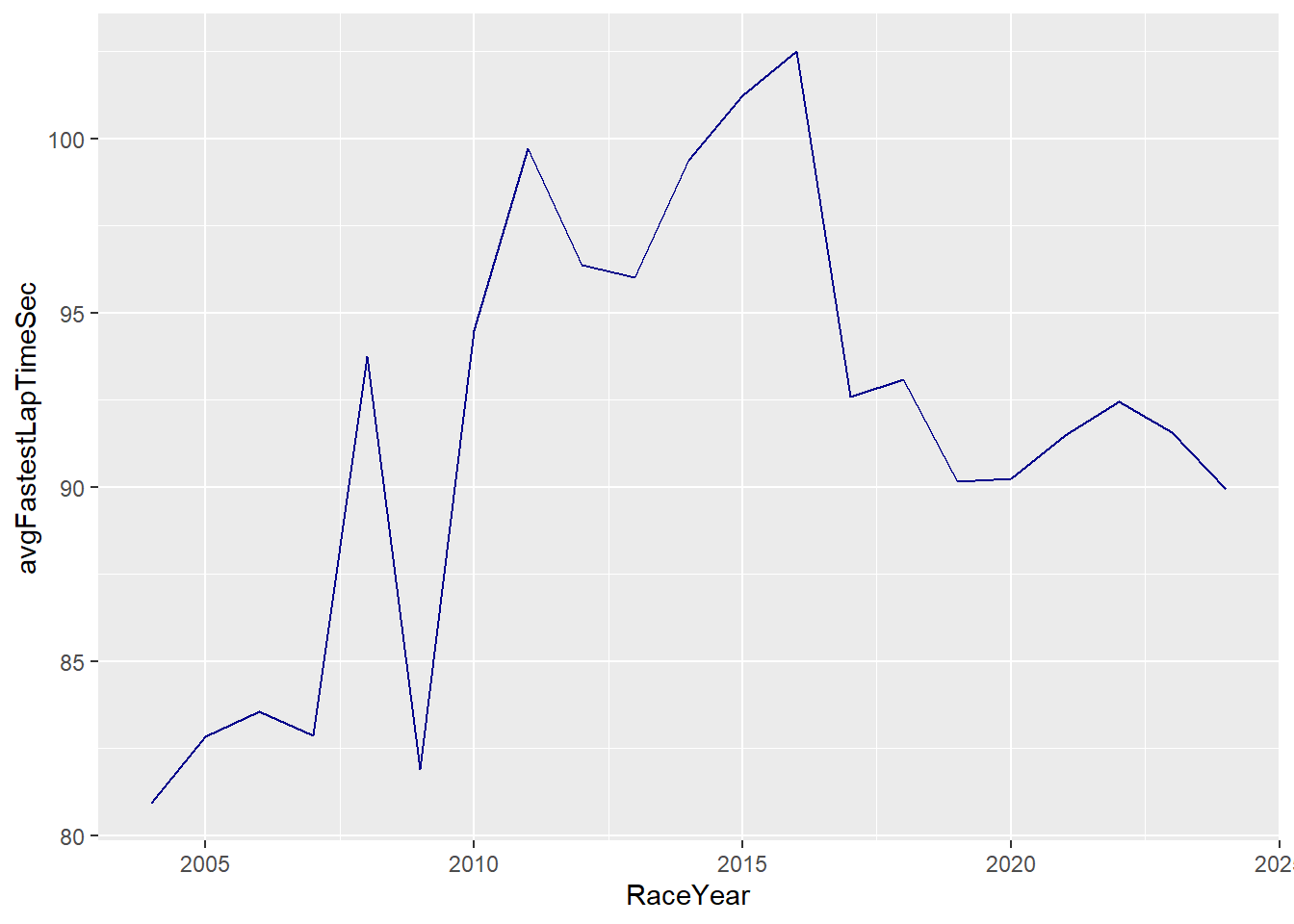 geom_line(aes(y=avgFastestLapTimeSec), colour="darkblue")
