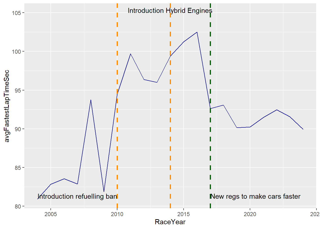 Some of the fluctuations can be explained by the introduction of new regulations. IN 2010 a refuelling ban was introduced, in 2014 hybrid engines were introduced and in 2017 regulations to make the car faster were introduced. Let’s add some reference lines to highlight these points in time.
