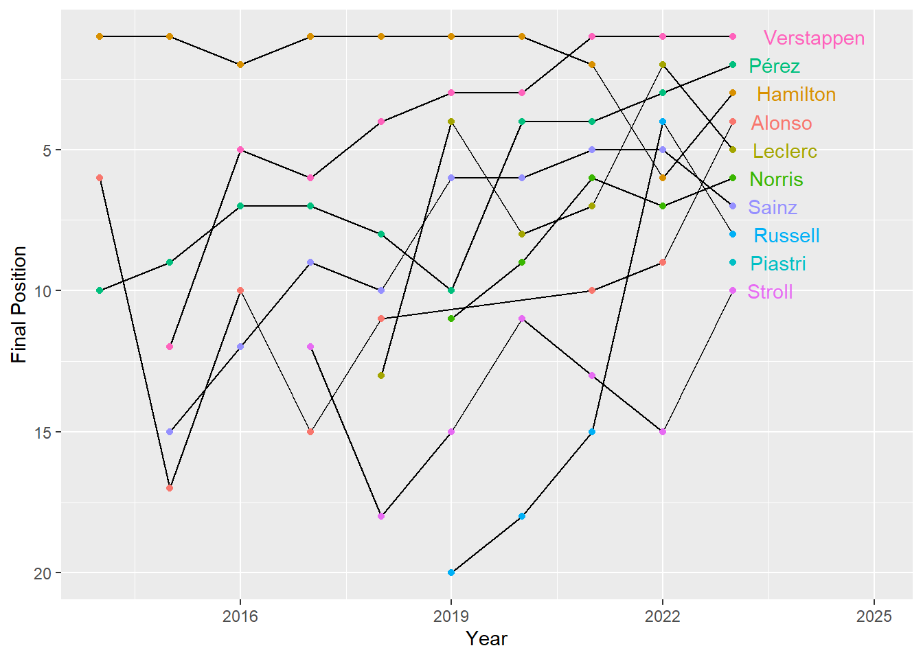 Next let’s focus on showcasing the top drivers 10 of last year (2023) and look at how they progressed in the last 10 years.