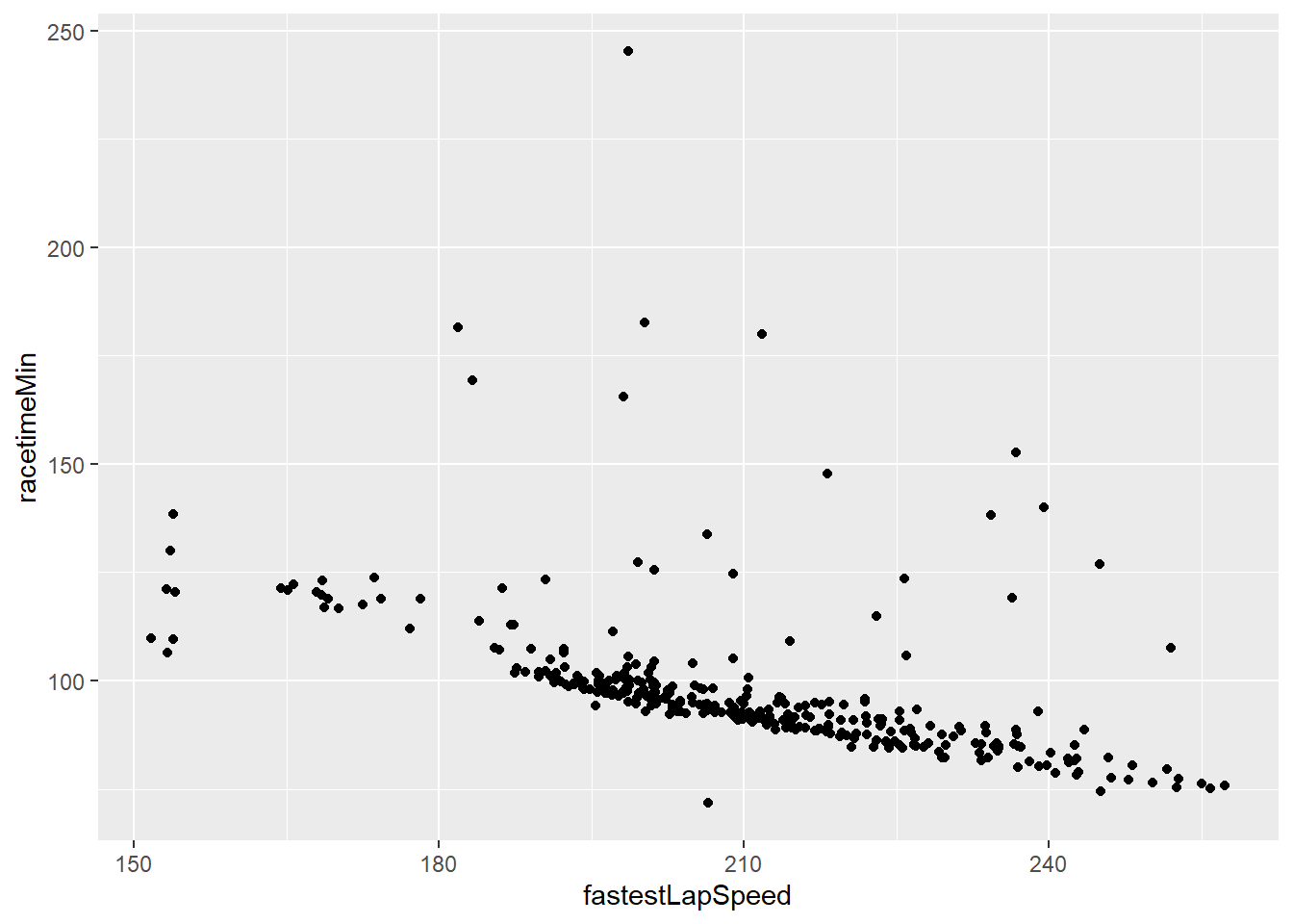 ggplot(aes(x=fastestLapSpeed, y=racetimeMin))+