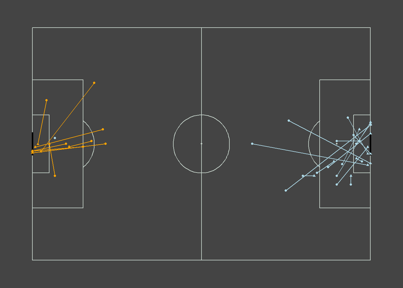 If our aim is to visualise the direction of the shots we can do this too using segments instead of points. Let’s have a look at plotting the trajectory of the shots.