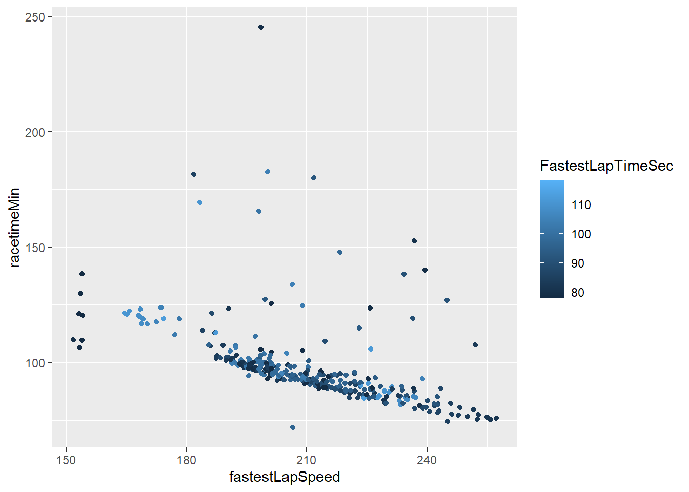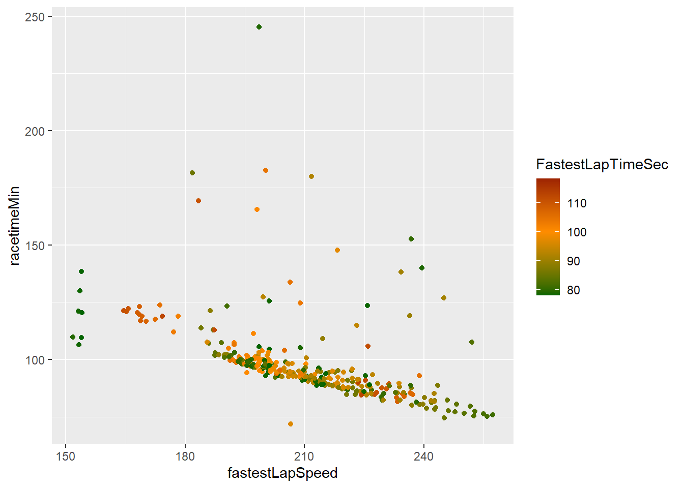 Next up we would like to adjust the plot to include one extra variables with colour being added for fastest lap time.