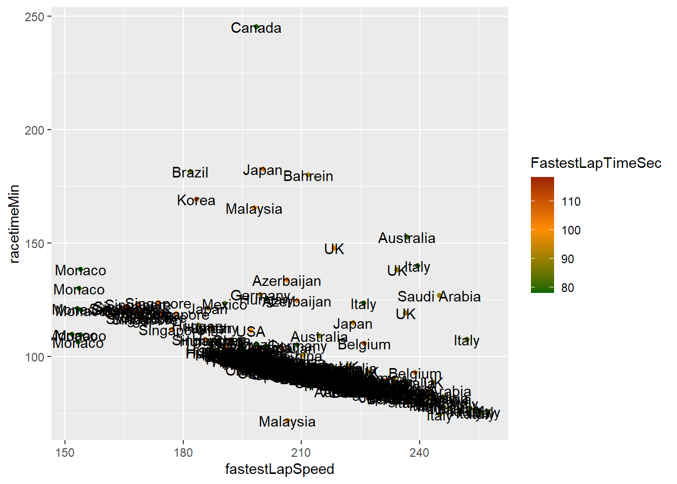 The graph we created now shows us a lot of information by using just one visualisation. However, it would be good to know which races are plotted. Let’s create a label which shows the country names.