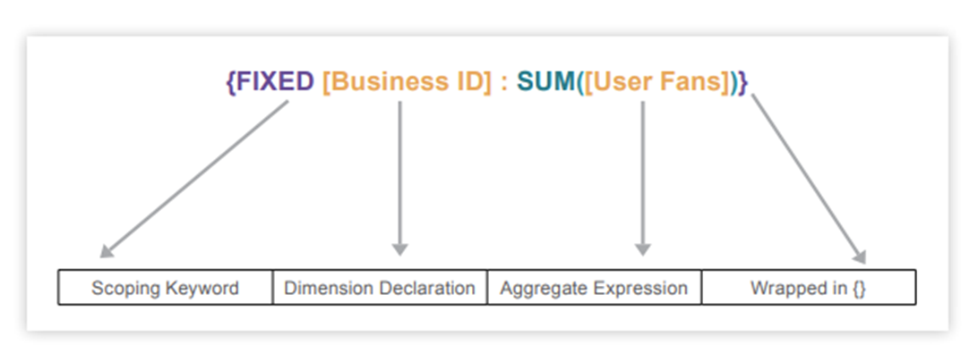 The expression tells Tableau to perform the aggregation for each Business ID, regardless of other dimensions used in the viz.