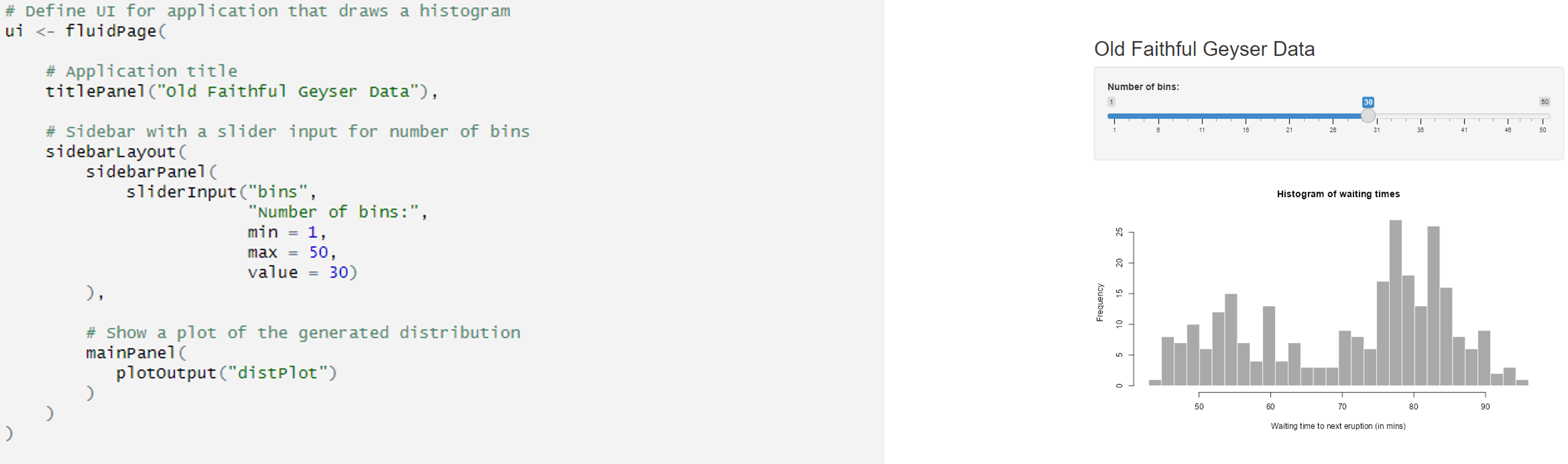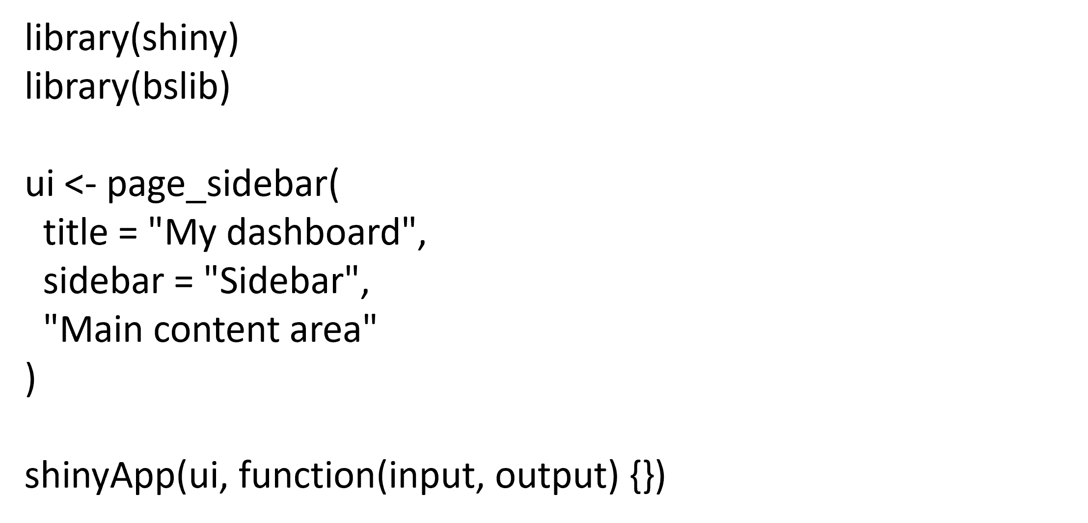 - Sidebar Layout (layout_sidebar): This function creates a sidebar layout, which typically includes a sidebar for inputs and a main area for outputs.