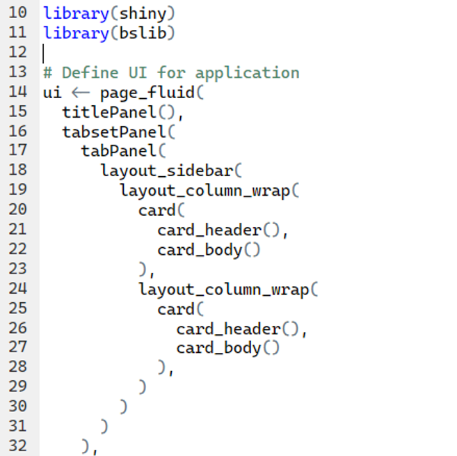 - Cards and Content Layout: Each main content section is wrapped in a card() which contains a card header and card body.